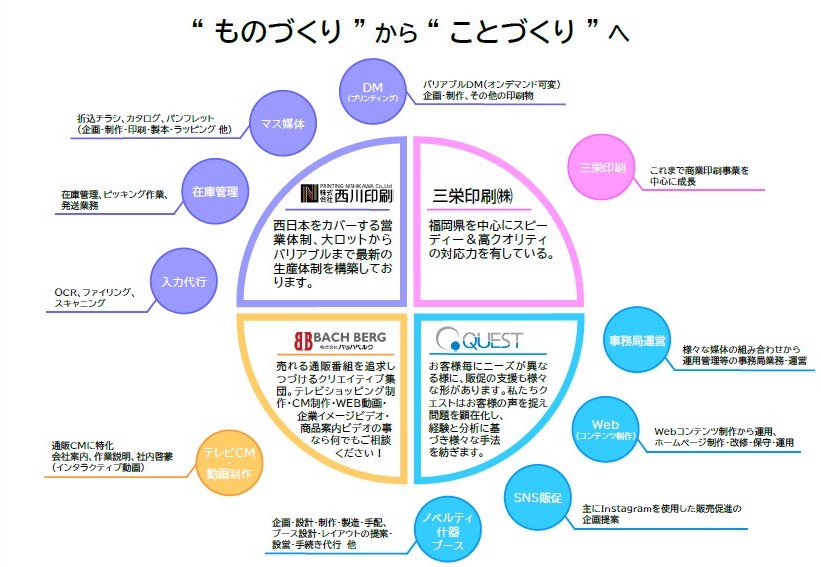 これにより、従来の印刷物という「ものづくり」に留まらず、デジタルコンテンツの制作・運用、販促キャンペーンの企画・運営、TV通販映像制作といった、お客様の多様なニーズに応える「ことづくり」までをワンストップでご提供できる体制を一層強化し、皆様の事業拡大により一層貢献できるものと確信しております。